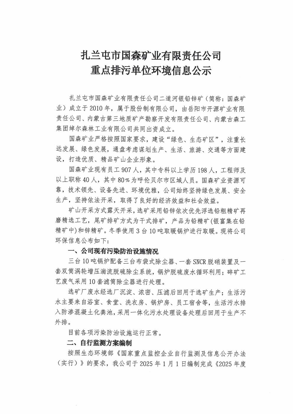 扎兰屯市国森矿业有限责任公司 重点排污单位环境信息公示